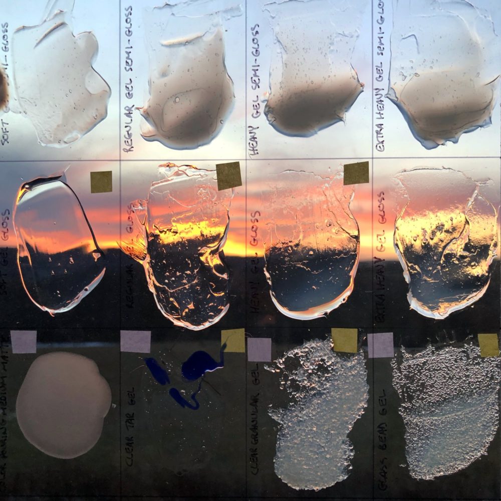 GOLDENアクリリックスのさまざまなメディウムをテストし、透明感などを把握していく。