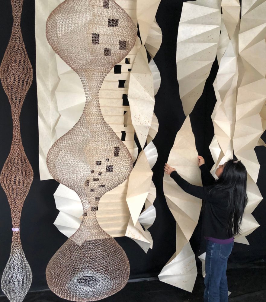 さまざまな素材を組み合わせ、その空間にあったアートを制作する。アトリエでのスターバックス リザーブ® ロースタリー 東京(東京・中目黒)のエントランスのためのアートワーク制作風景。左手はワイヤーを加工して編んで造形したもの。右手は和紙を3種類使い特殊な折型をつけ、GOLDENのファインゴールドとファインブロンズをスパッタリングして表情を加えている。