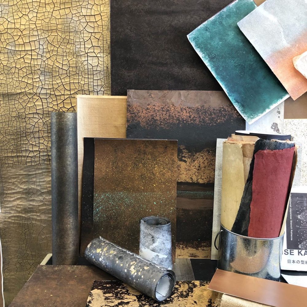 GOLDENアクリリックスヘビーボディーの、ゴールドとパールの「マイカ フレーク」を使った色出し見本。各プロジェクトでは大量のサンプル見本を作成し、空間デザイナーと検証しながら進める。