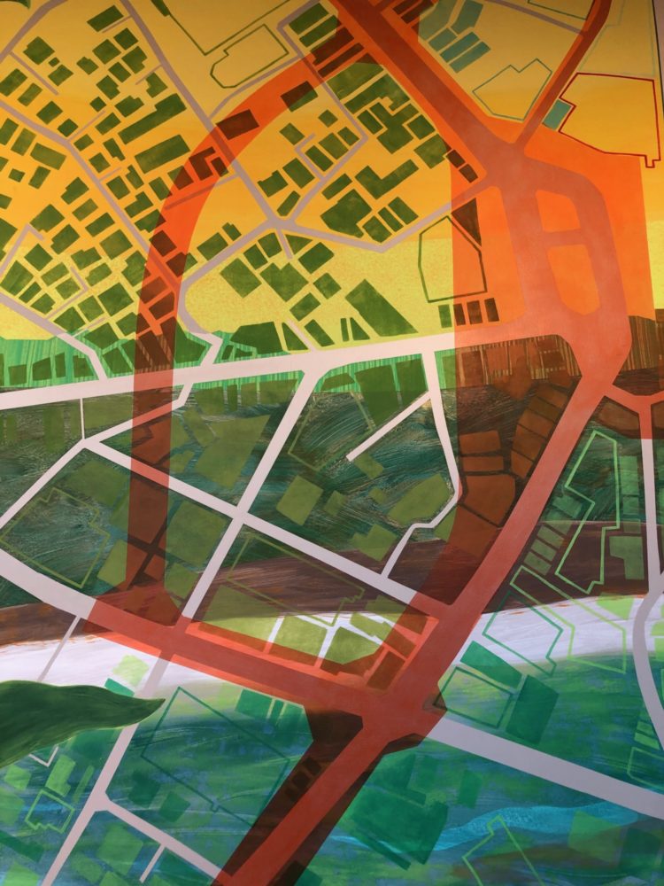 小岩駅周辺地図壁画の部分。オレンジのラインは、アクリル絵の具の透明さを活かし、いずれ駅前にできる新しい道を表している。