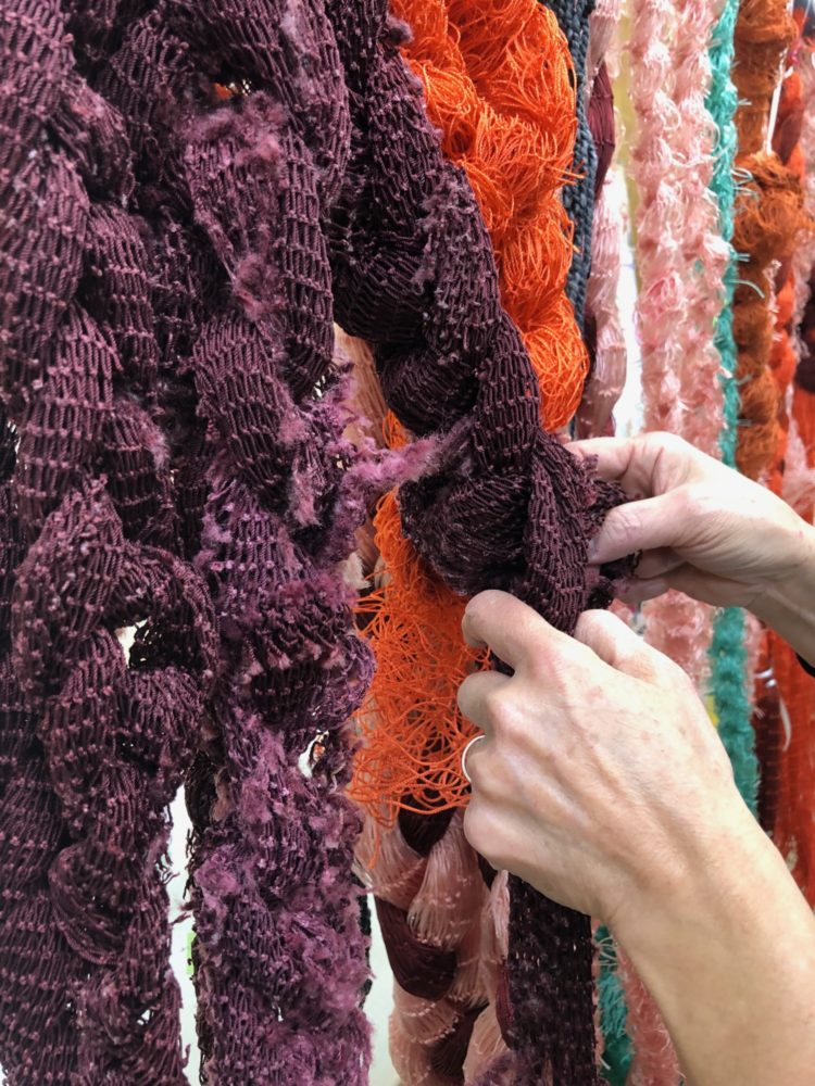 スターバックスコーヒー皇居外苑 和田倉噴水公園店のアートワークの制作風景。廃棄される予定の漁網を引き取って、複数の編み方でハンギングをつくった。