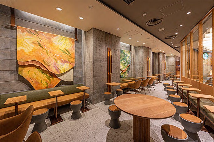 スターバックスコーヒー六本木ヒルズ メトロハット/ハリウッドプラザ店にあるTEAの専門店TEAVANA(ティバーナ)のアートを制作。手仕事の価値を大切にしたインテリアデザインとアートコンセプトが共鳴し合うようデザインペイントのハンギングアートを壁面に施した。写真提供:スターバックス コーヒー ジャパン