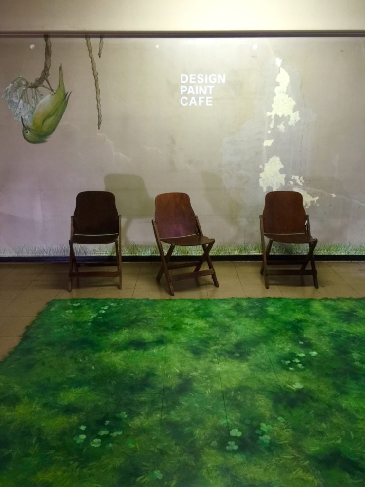 ヨザンさんは「デザインペイント」というまだ知られていない分野を発表するため、築55年のビルのワンフロア70坪に、3年にわたり展示をおこなった。壁面に合うように鳥の壁画を描き、既存の塩ビタイルの床には芝生のトロンプルイユ(騙し絵)を施した。会場提供・協力:下田通称株式会社