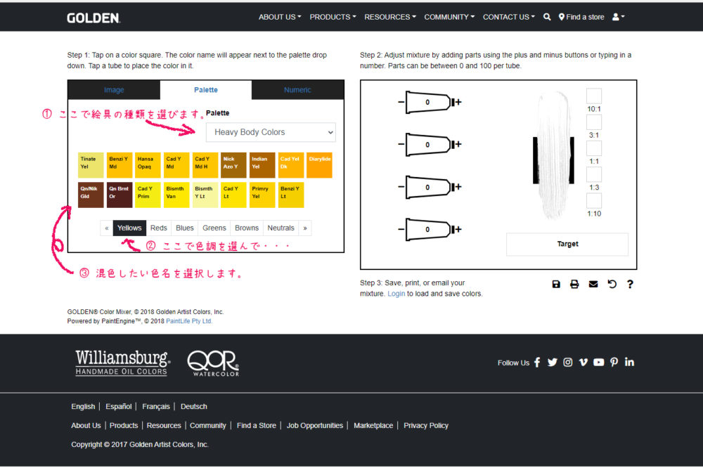 ゴールデンのアクリル絵具を、任意の配合比で混色したときにできる色がバーチャルでわかる機能です。