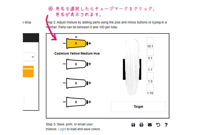 ⑥チューブマークの両端にある+と-のマークをクリックして、混色の配合比をお好みで設定します。なんと0から100まで配合量を増やしたり減らしたりできるので、かなり細かく設定できますね。