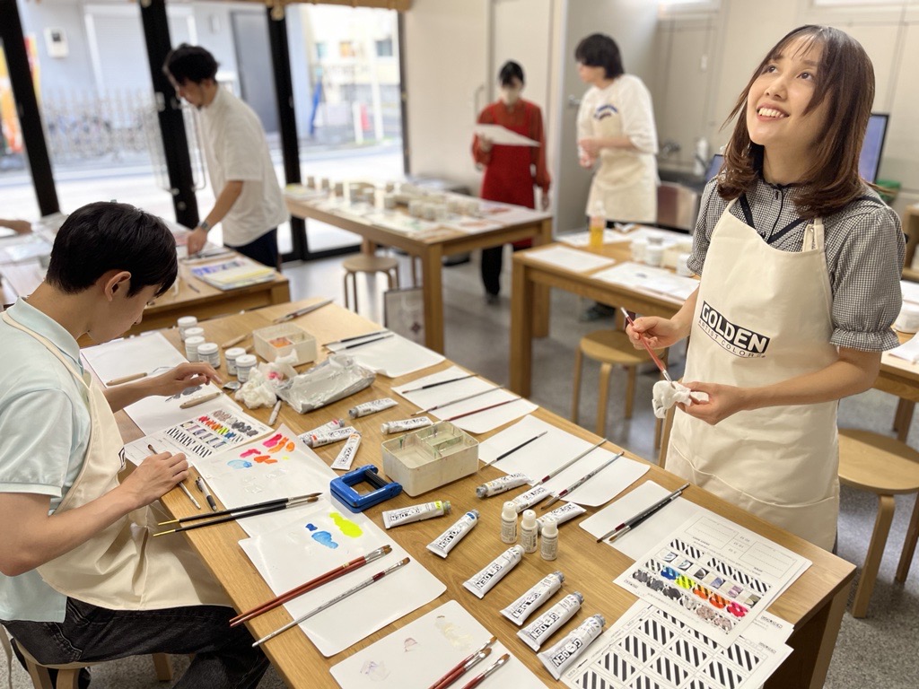 田村さん:私は普段からアクリル絵具を用いて制作していて、主にステイニングの技法を使っているのですけど、ゴールデンアクリル絵具は、同じアクリル絵具でも色とか種類によって、顔料とか、粒子の拡散の仕方が違うので、そうしたところが面白いなと感じていました。普段から材料研究をしながら制作しているので、ゴールデンのサポーター制度はぴったりな機会だなと思い応募しました。
