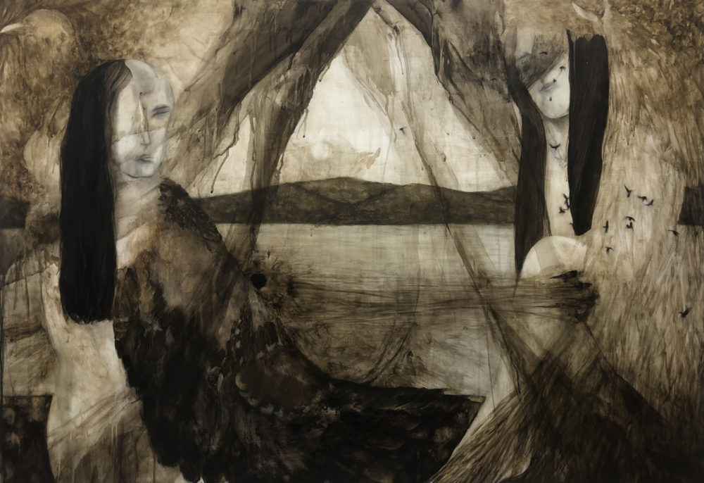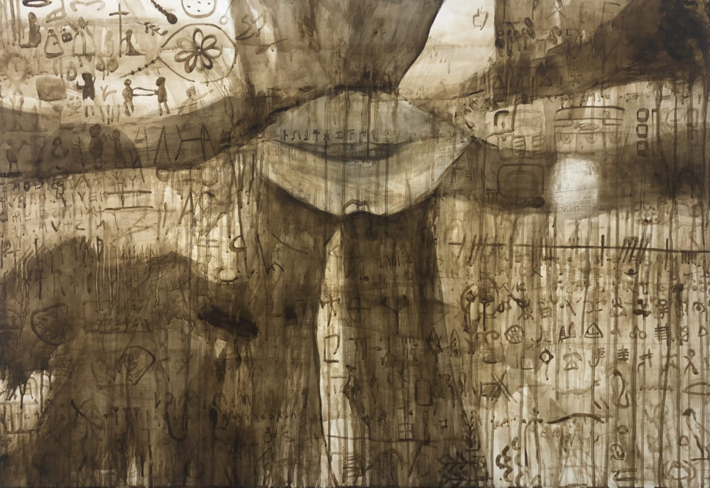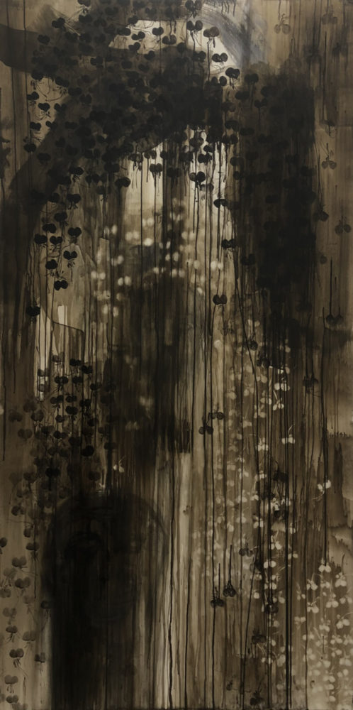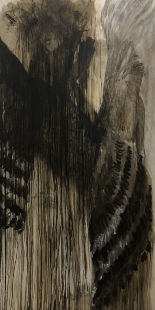 小野田さん:私は制作をする際に、観察対象として『風土』を意識している部分が多くあります。その理由は、自分が生活をしているときに、『周りと違うな』と思うことが結構あって、世界規模で見てみると、自分と別の土地の人とは全然違うし、当然アジアとヨーロッパは違う。『その土地の性質によって違うところは必ずある』と感じることがよくあって、『風土』を観察対象として制作を進めています。その延長で素材も気にしていて、自分の肌になじむというか、和紙とか、墨など、アジアになじみのある画材を使っています。これまでアクリル絵具は使ってこなかったのですが、今回この機会を頂けたので、自然の作用に反発しているというか、そういう画材に挑戦して、素材自体、合成樹脂であったり、そういうのにも関わってみたら自分の表現の幅が増やせるのかなと思い、今回応募いたしました。