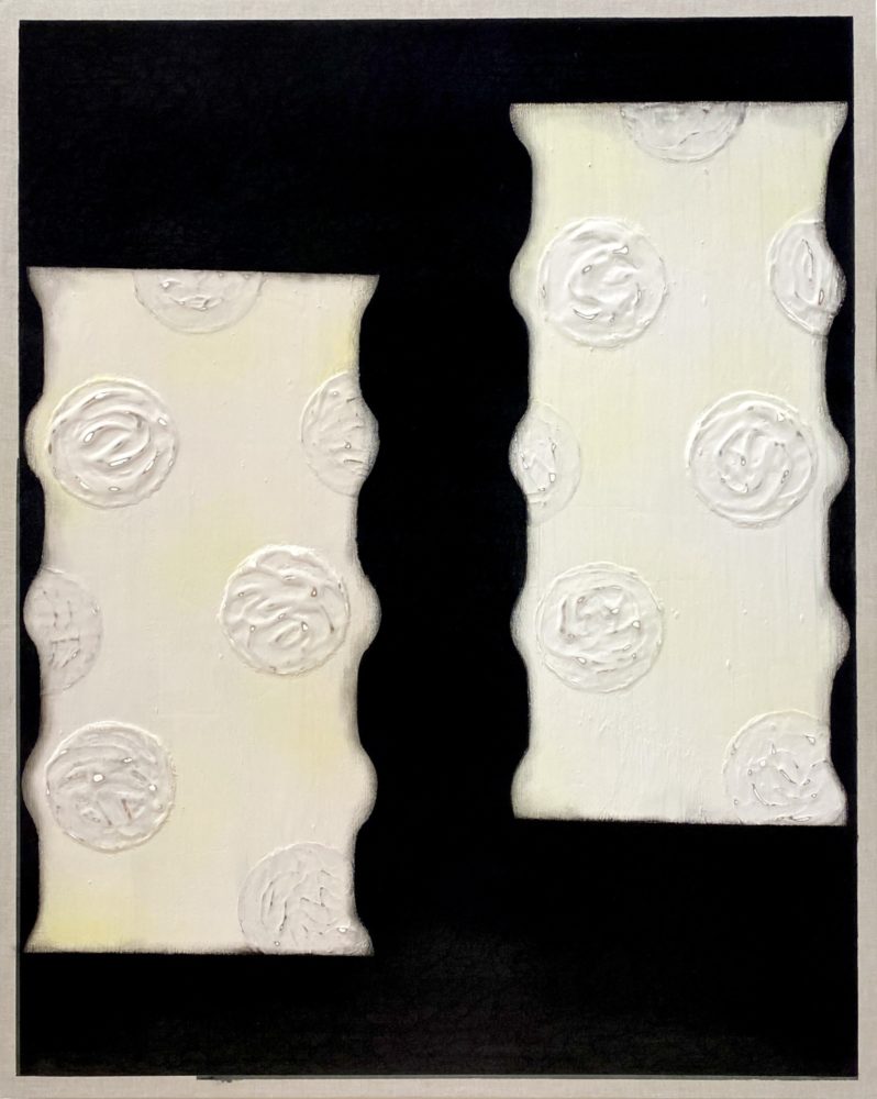 女性として社会に感じる違和感や怒りを直接的な主張ではなく、映像的な比喩を通して表現する。支持体には砂や軽石を混ぜ、アクリル絵具と油絵具を重ねて古いフィルムの粒子のような質感を作り出す。