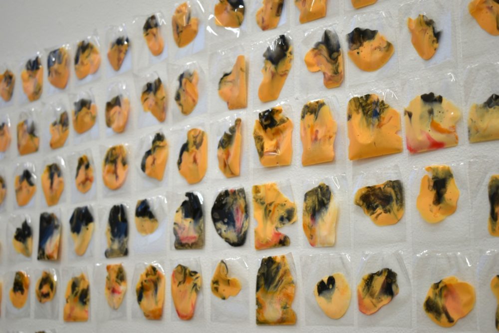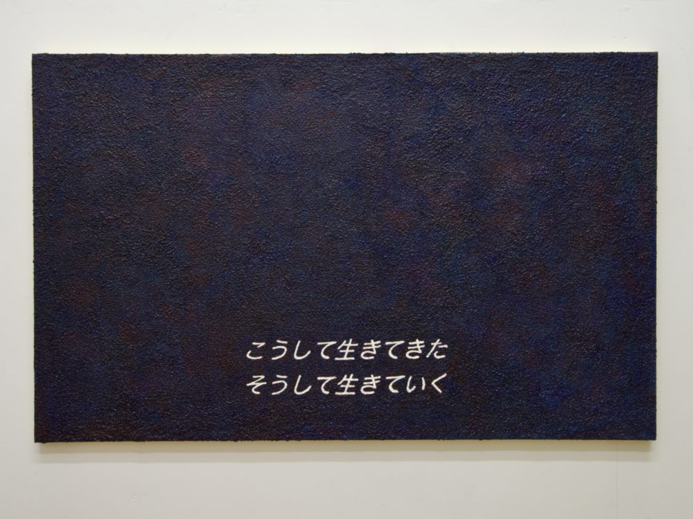 近作では、二重構造の絵画作品や、固形化した廃油を並列させたオブジェなど、技法的な冒険を試みています。
