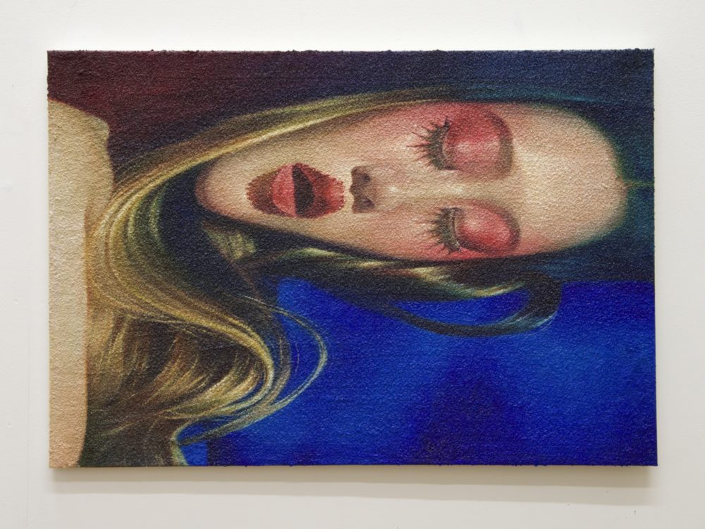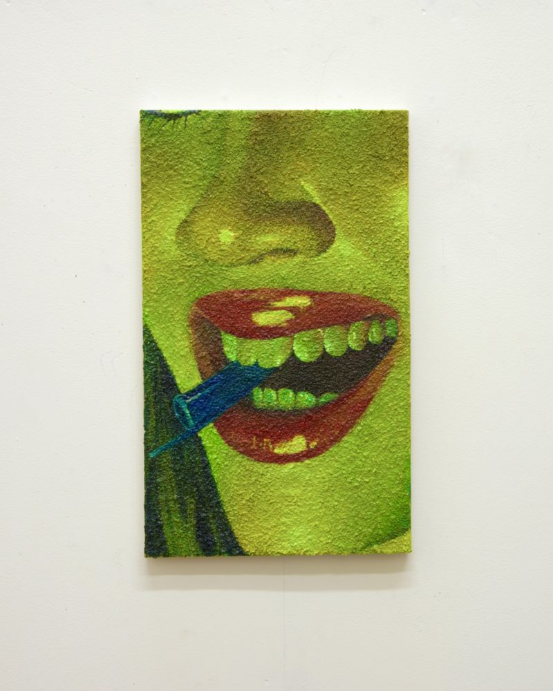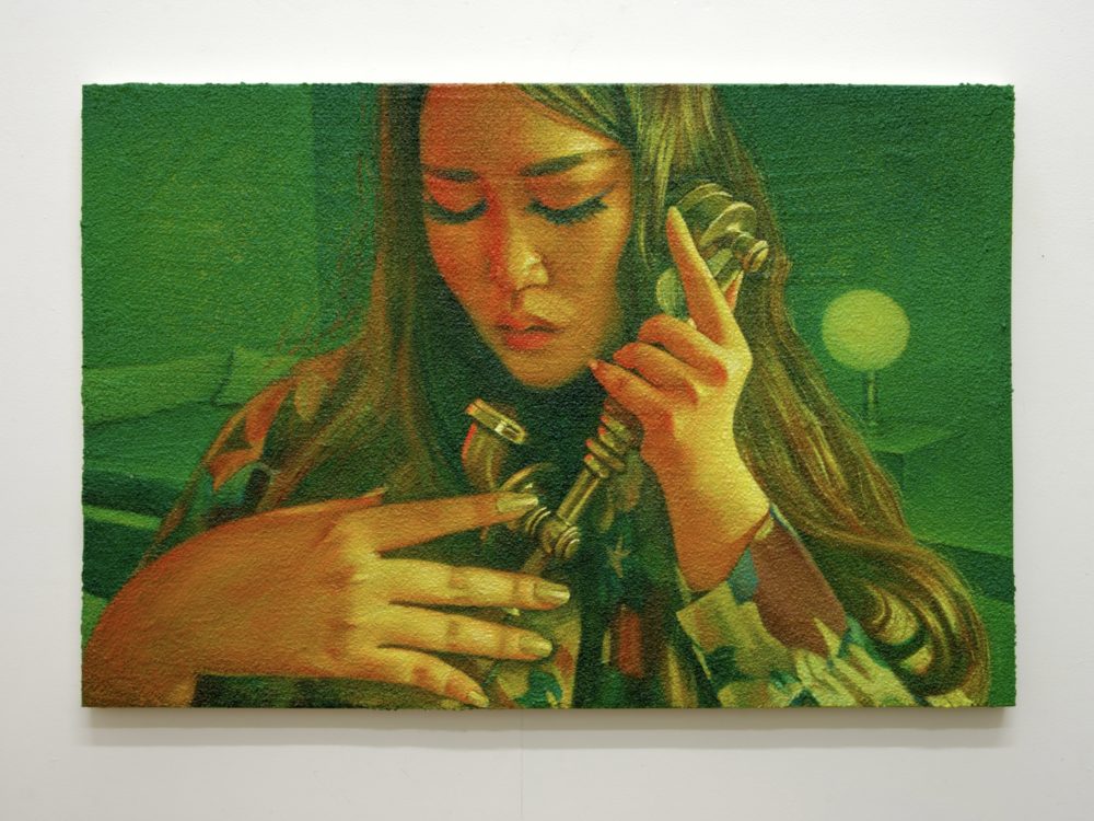 坂本さん:作品のコンセプトとしては、映画や妄想している映像のイメージなどの実体のないものを物質感の強いキャンバスに「もの化」するということを掲げています。粒子感が強い方が良くて、砂などの粒子感のあるものを下地に使っているのも、デジタルではなく、フィルム特有のザラザラした粗い感じの動画性を表現するために使っています。最後にグレーズする理由としては、画面上の粒子感をより強くするためです。やっぱり、最初に粒子感の強い下地を作っていても、アクリルで描いていくとすぐ乾燥して目が埋まってしまって、せっかく作った粒子感を上から抑え込むような絵肌になってしまいます。でも、最後に凹凸のうえからシャバシャバの油をかけることで、それが凹凸のへこんでいるところに溜まって、より粒子感が強くなるんです。あとは、アクリルが濡れ色になるのが最大のメリットとしてあって、乾くと少し明るくなるというか、白っぽく発色する色が目立ったりするので、絵の中でかなり暗い画面、奥に空間がいってほしいところには濃い目に油を重ねたりして制作しています。
