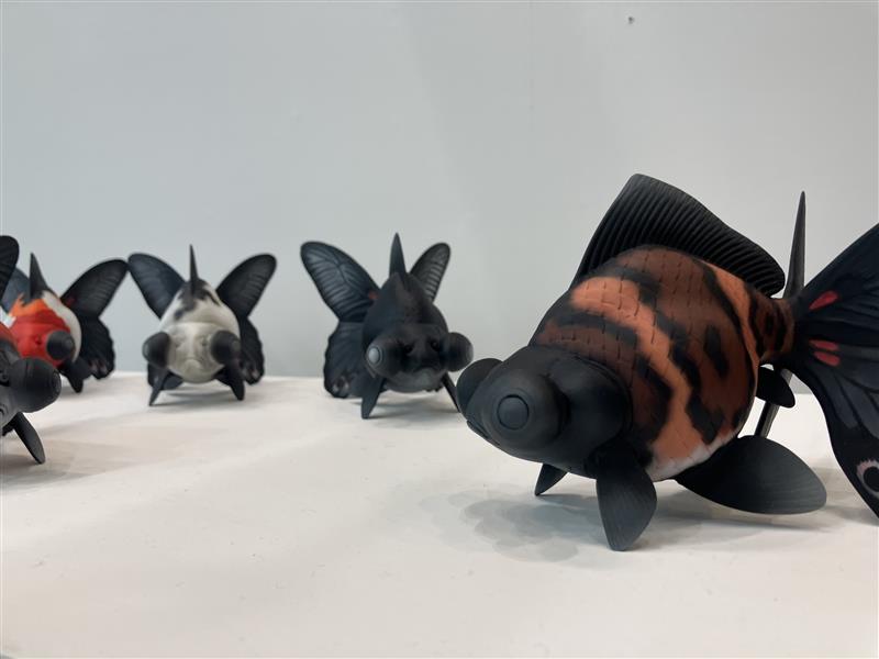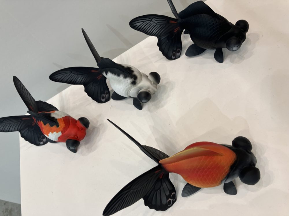 こちらは、出目金をモチーフにした立体作品。一見すると、斑模様の美しい出目金に見えるが、尾びれに目を向けると、そこに羽を広げた蝶の姿が現れる。本来、地上と水中という交わることのない領域に生きる生物同士がこうして一つの形態の中で融合している点が特徴的なこの作品。その違和感と調和が同時に成立することで鑑賞者に新たな視点と発見を促しているのだろうか。