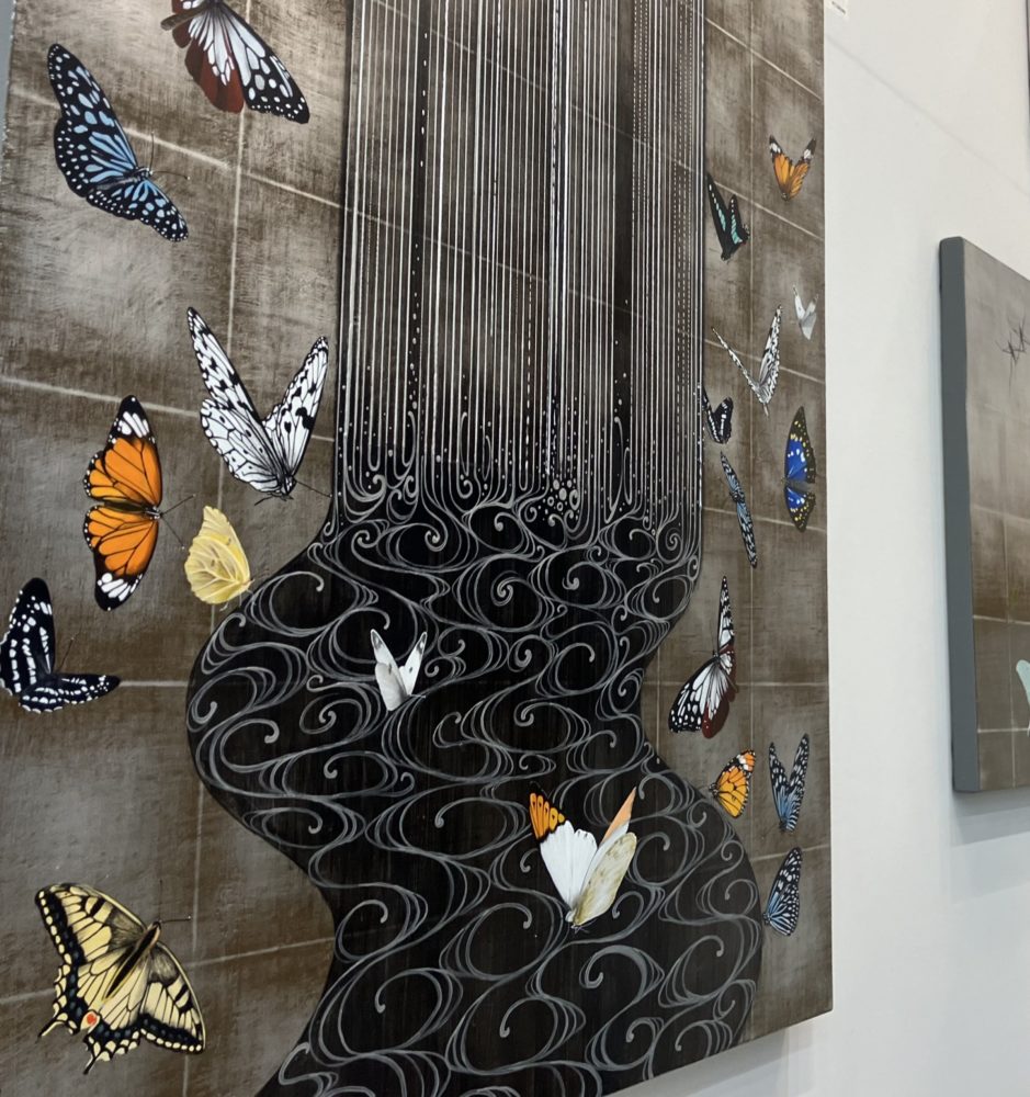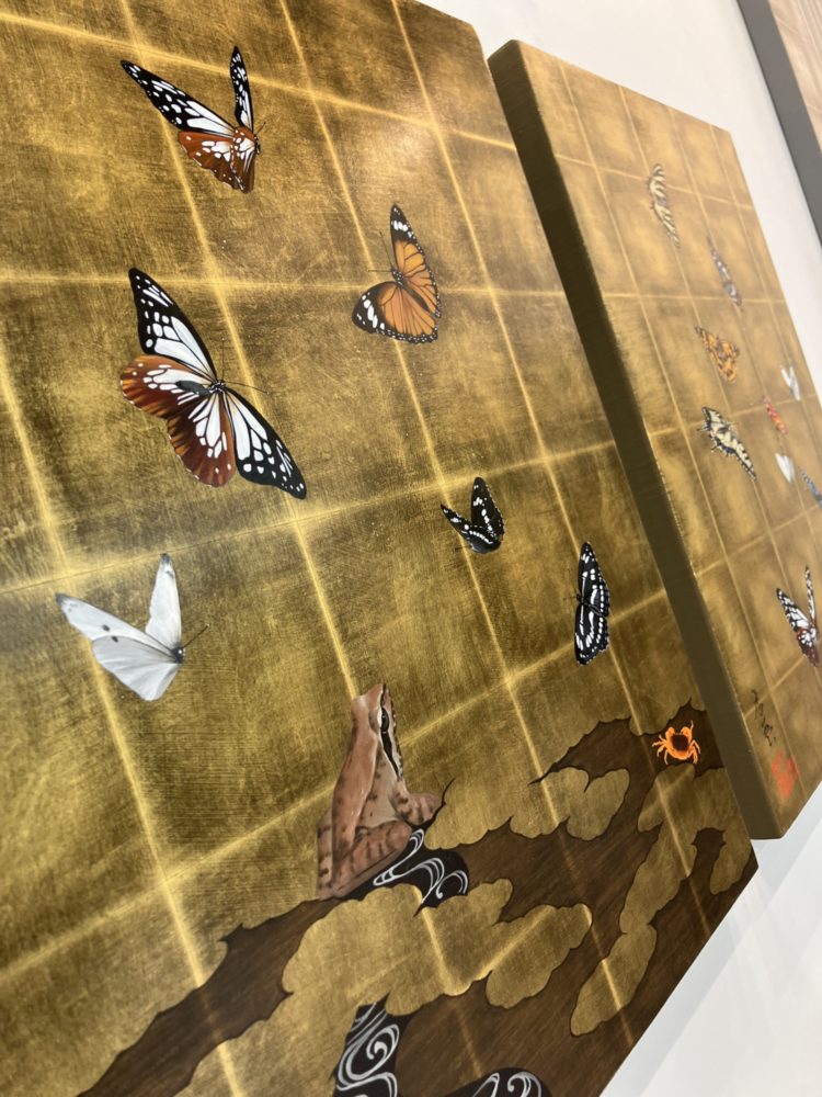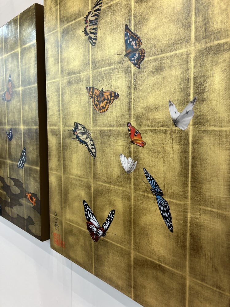 小松孝英先生といえば、琳派の作品を現代に再構築したような作風で知られている。琳派を彷彿とさせる金箔地の上には鮮やかな蝶の群れをはじめとした無数の生き物の姿が映し出されている。ただし、そこに浮かび上がるマチエールは、日本画の画材で表現されたものではなく、アクリル絵具、とりわけゴールデンアクリリックスの絵具やメディウムを駆使して表現されたものである。今回は、「ART FAIR TOKYO 2026」で展示された作品の一部をご紹介する。