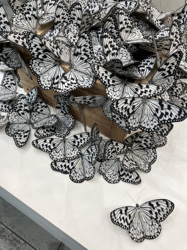 いまにも飛び出しそうな無数の蝶が木箱からあふれ出ている。小松先生は、緻密に描写された平面作品だけでなく、立体作品も精力的に創作されている。