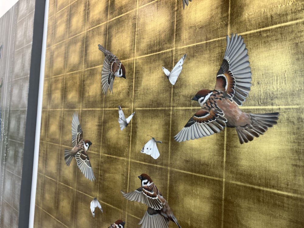 小松先生が描く生き物の多くは、ゴールデンのアクリル絵具で描かれている。絵具の粘度や流動性を安定して調整できるゴールデンの特性により、筆致のブレやにじみを抑えつつ、細い線やエッジを崩さずに描き進めることができ、形を明確に定着させることが可能になる。そのため、羽の角度や重なり、進行方向といったわずかな差異が視覚的に読み取れる形で描き分けられ、蝶と雀が空間の中で関係しながら動いているような印象を生み出している。