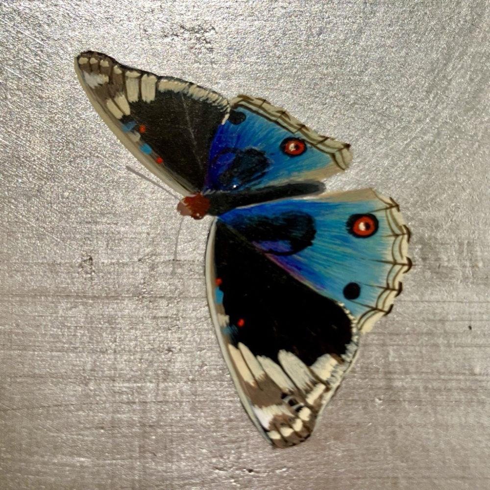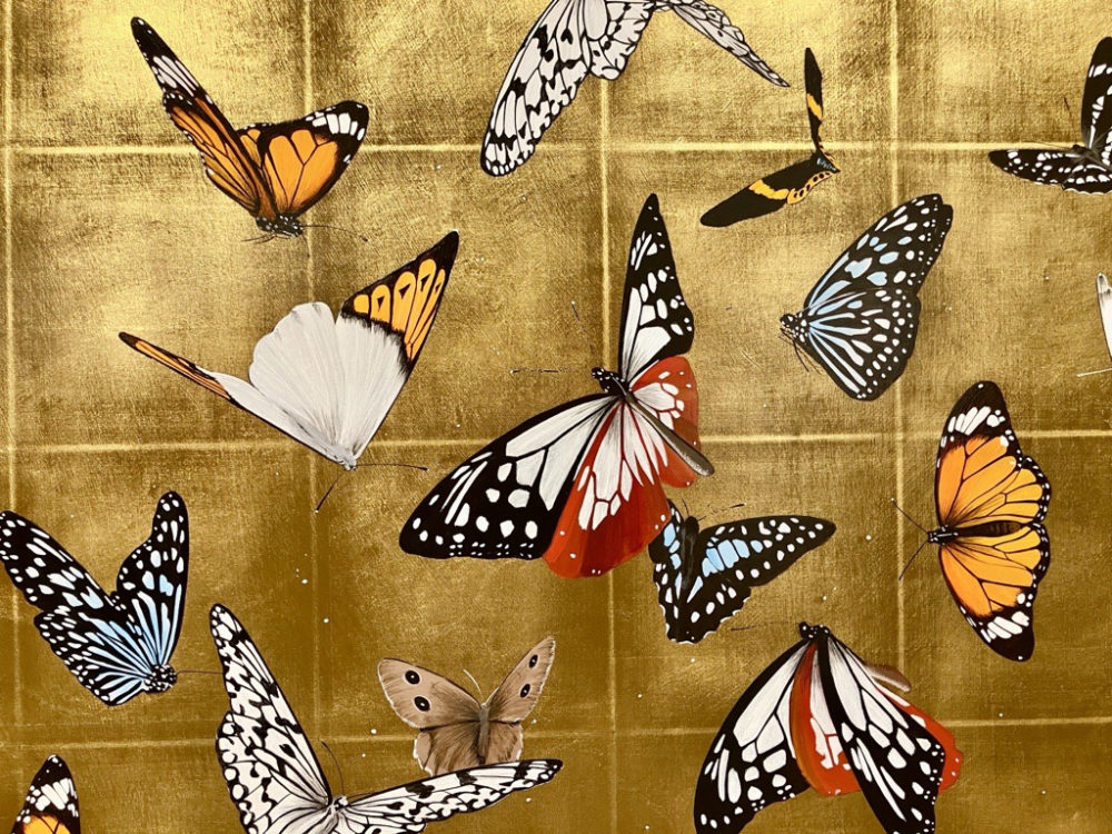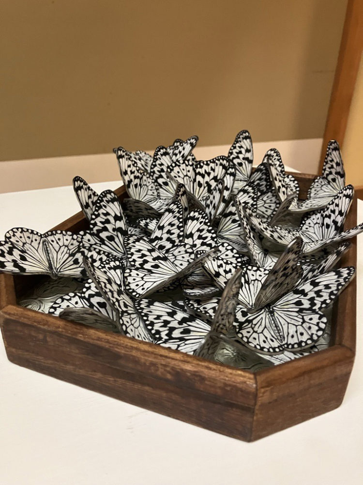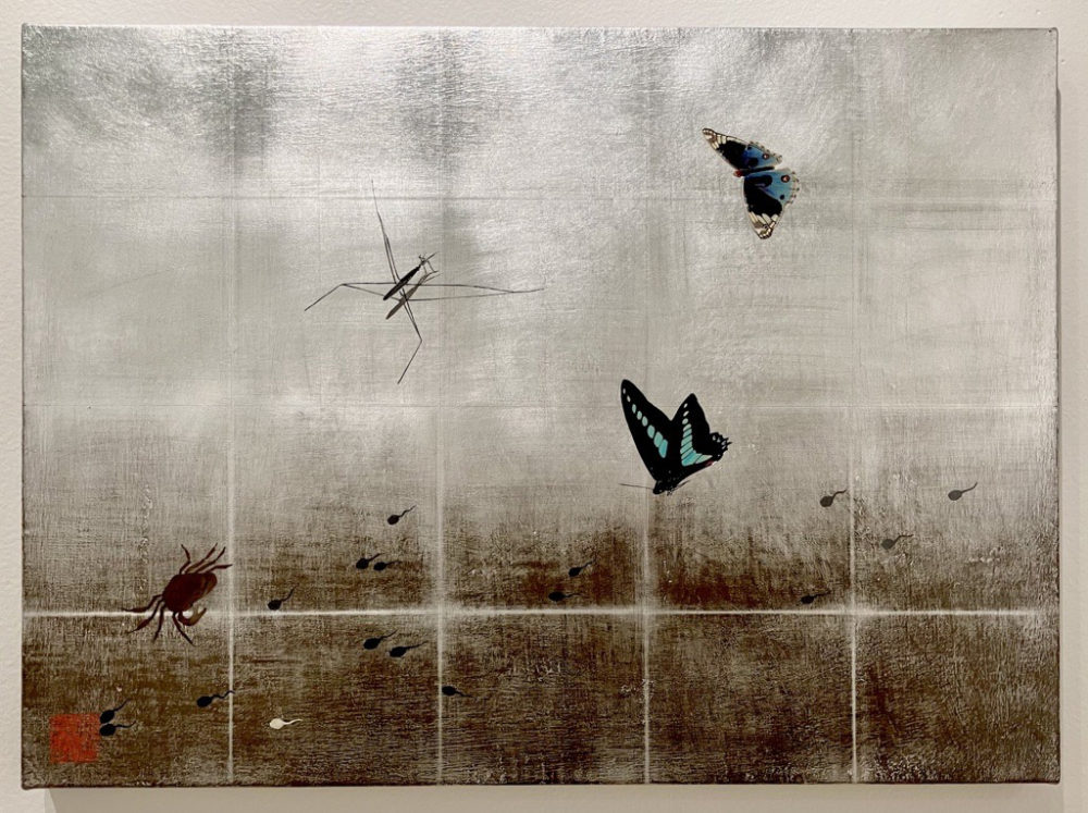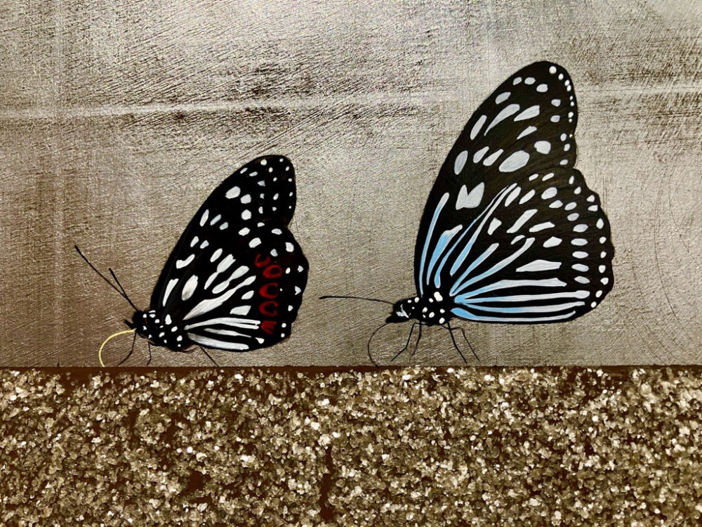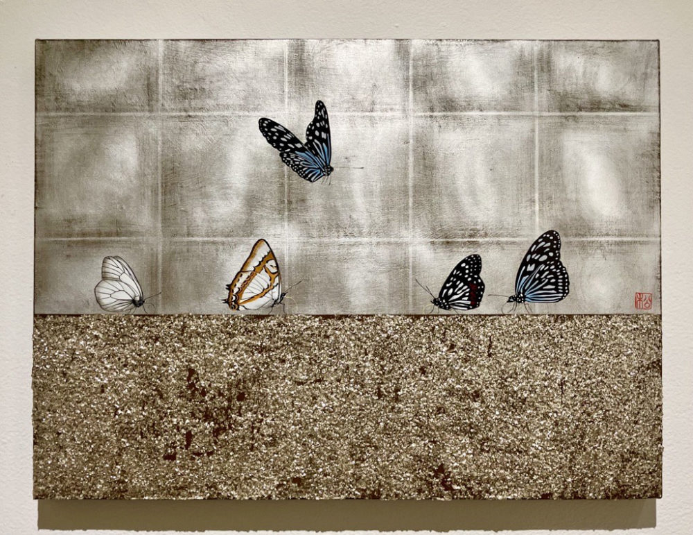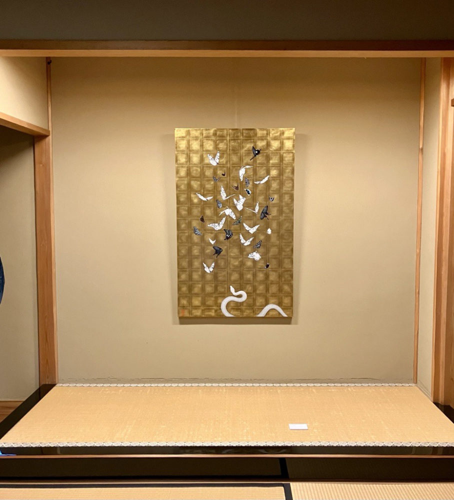 床の間の前には、金箔地の作品から飛びだしてきたような蝶の立体作品がありました。
