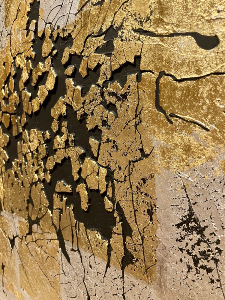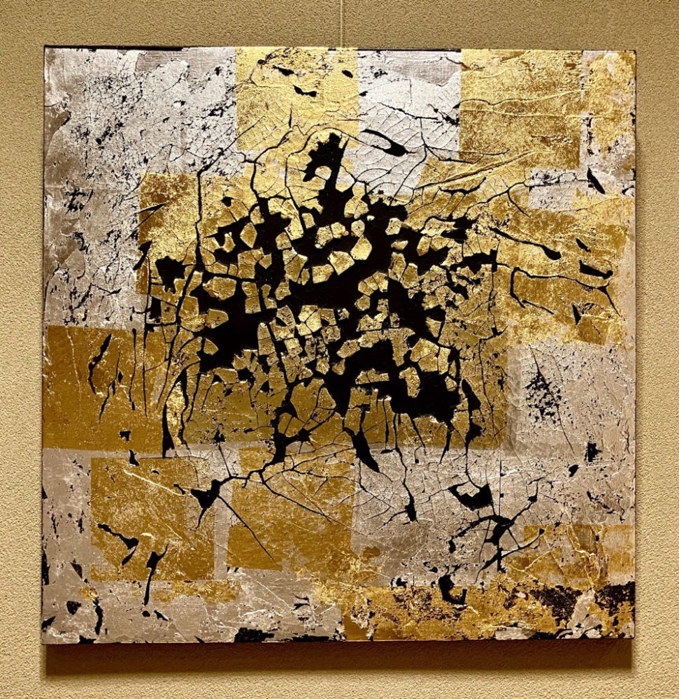 今回もゴールデンアクリリックスのクラックルペーストやマイカフレークで制作された作品が展示されていました。