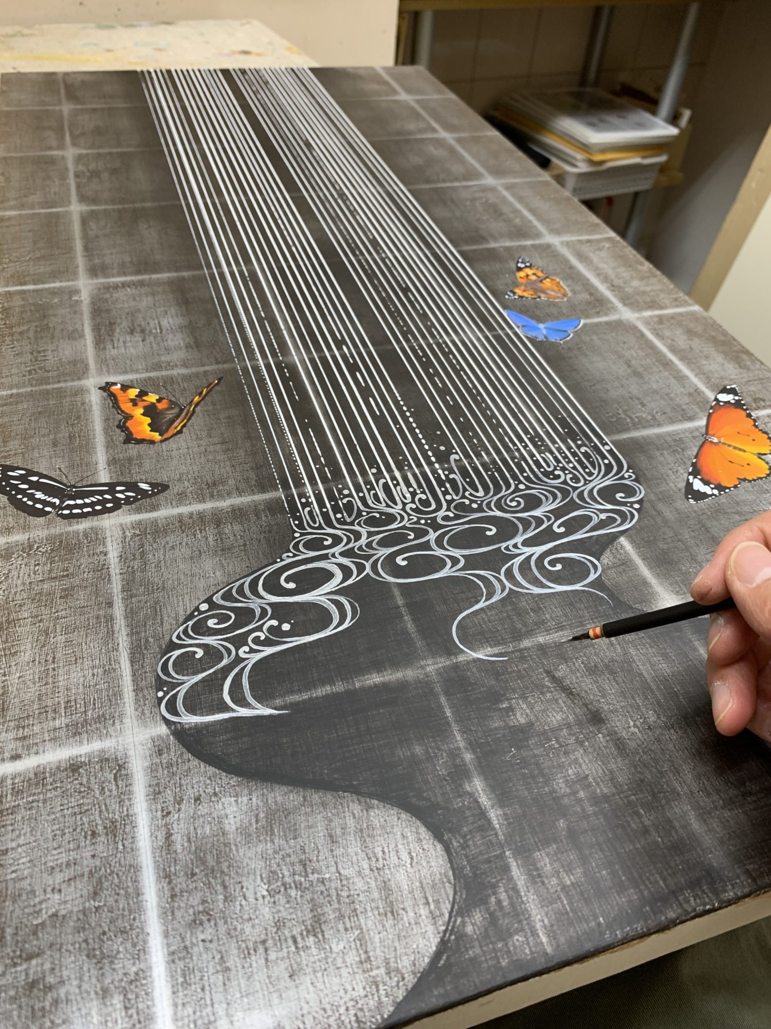 A:そうですね。あと、蝶というのはすごく弱い小さい存在なので主役になれない。だから、さっきも言ったように、ここに蝶を描いておけばいいかくらいの脇役にはもってこいの存在なのですけれど、主役になれないものを主役に押し出す力を見せたいというのもあって、蝶を主役に描いています。