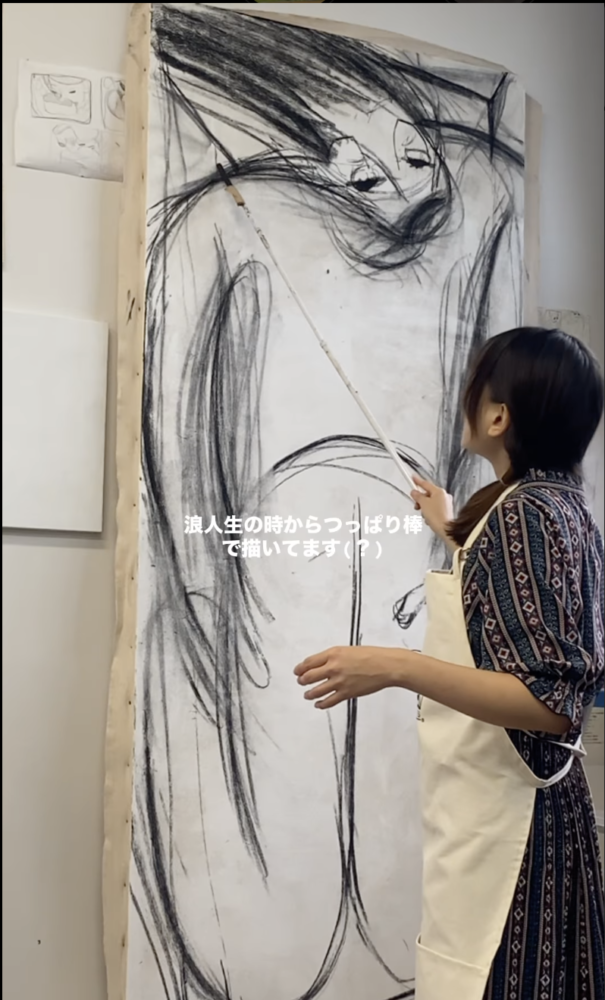 画材を変えると、強制的にいつものスタイルから移り変わるのが重要っていうか……。使ってる筆とかも、マティスがすごく長い竹みたいな筆を使って遠距離で描いていたのを真似して、突っ張り棒に木炭を付けて描いたりしたんですよ。